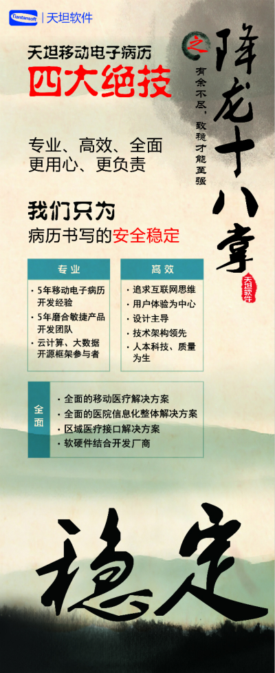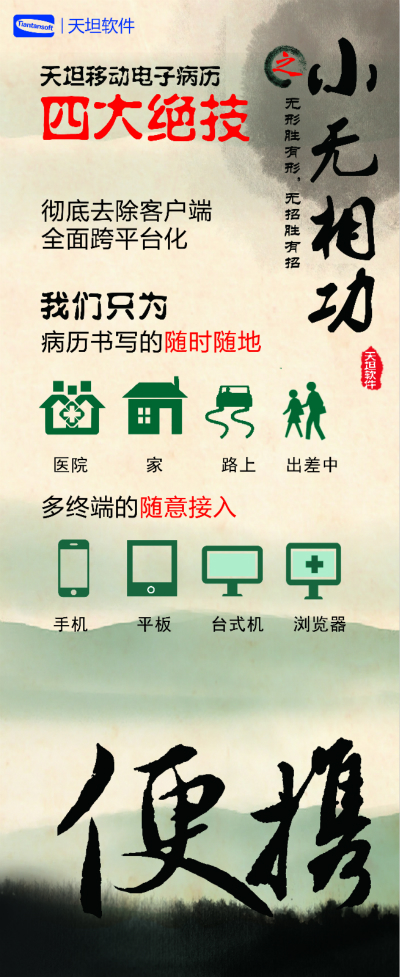 天坦軟件,作為國內(nèi)移動電子病歷的先行者,盛裝亮相京交會。在會上展示了以“天坦移動電子病歷”為核心的醫(yī)院整體信息化系統(tǒng),受到眾多參觀者的關(guān)注。天坦軟件始終堅持以“讓天下沒有難看的病”為宗旨,致力于醫(yī)療事業(yè)發(fā)展。為中國醫(yī)療衛(wèi)生行業(yè)的信息化建設(shè)以及個人健康服務(wù)提供從硬件到軟件、從技術(shù)到服務(wù)的全面解決方案,是中國醫(yī)療信息化市場中快速成長的獨(dú)立軟件廠商之一。數(shù)年來,一直堅持研發(fā)以移動電子病歷為核心的醫(yī)院信息化系統(tǒng),從移動框架的病歷編輯器到跨平臺的移動醫(yī)療解決方案,為整個病歷信息化行業(yè)注入了極強(qiáng)的創(chuàng)新活力。 “天坦移動電子病歷”為核心的醫(yī)院整體信息化系統(tǒng)秉承“高效應(yīng)用、信息互通”的基本理念,是專門為醫(yī)院設(shè)計開發(fā)的醫(yī)療信息化系統(tǒng)的核心組成部分。具有高效、安全、穩(wěn)定、易用、移動、智能等特點(diǎn),除此之外,還具有穩(wěn)定、完全跨平臺運(yùn)行、功能強(qiáng)大、系統(tǒng)性能卓越等巨大優(yōu)勢。